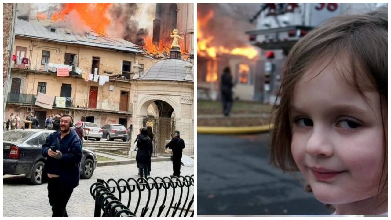 Во время сегодняшних обстрелов во Львове на камеру попал человек, который напомнил всем известный мем. Улыбающийся мужчина в наушниках счастливо и беззаботно шагает по городу, не ведая, что прямо за его спиной – прилет и пожар.