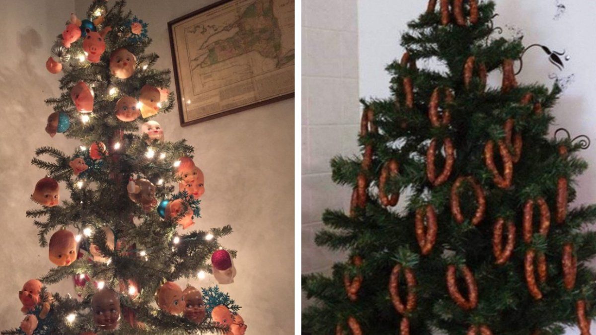 Но не расстраивайся! Даже твоя елка будет выглядеть королевой на фоне этих роковых деревьев, которые умудрились поставить дома люди. Одни праздничные символы – косые и кривые, как будто вот-вот упадут, другие сделаны из подручных материалов, которые лучше было бы использовать по назначению. А этот сумасшедший декор! Головы кукол вместо шариков, колбаса вместо гирлянд!