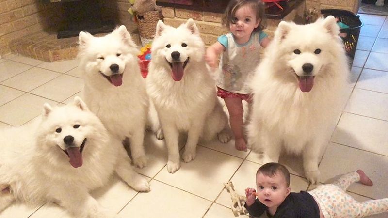 Хотя парочка воспитывает только двух детей, зато вместе с ними растут еще и четыре щенки и их родители породы самоед.
