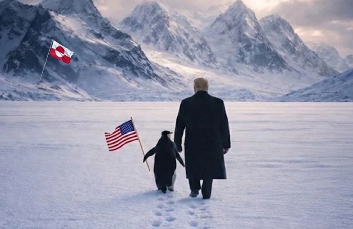На картинці Трамп іде поруч із пінгвіном, який тримає прапор США. Обидва прямують у бік прапора Гренландії. "Обійміть пінгвіна", – таким є підпис до зображення.