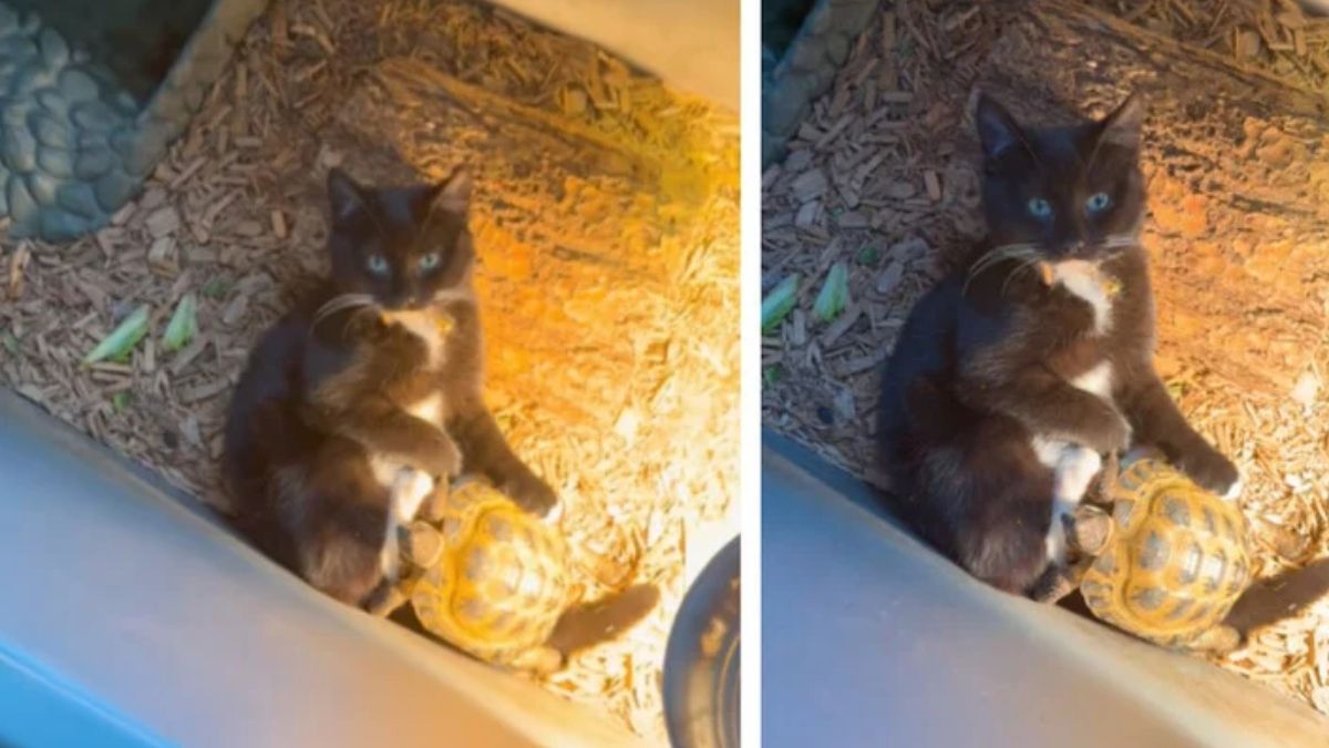 Кіт спокійно сидів…у вольєрі з черепахою. Ці двоє сиділи поруч, здавалося, абсолютно розслаблені. На відео видно, як кіт лежить на спині, а черепаха обережно тягнеться до нього, ніби хоче встановити контакт і обійняти його.